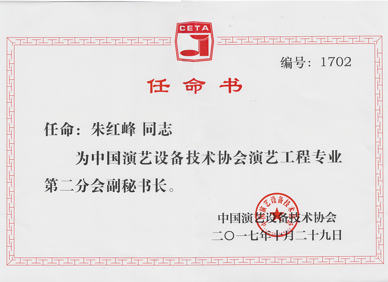 热烈祝贺重庆汇锦电子工程有限公司董事长朱红峰先生被聘用为《中国演艺设备技术协会第二分会副秘书长》